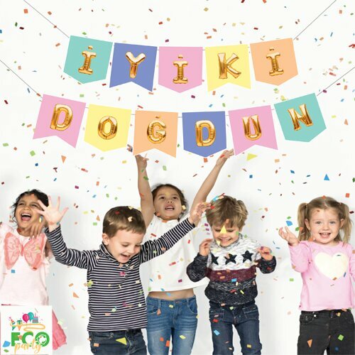 Tatlı ve soft pastel makaron (macaron) renkli zemin üzerine Gold (Altın) yaldızlı harflerle "Happy Birthday" yazılmış doğum günü asma banner afişi. Çevreci özel zarf ambalajı ile gönderilir, baby shower ve kız çocuk partilerine çok yakışır.